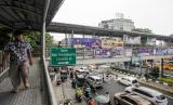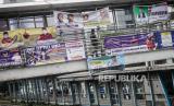 REPUBLIKA.CO.ID,JAKARTA -- Warga berjalan melewati jembatan penyeberangan orang yang dipasangi spanduk peserta Pemilu 2024 di kawasan Salemba, Jakarta, Jumat (8/12/2023).