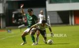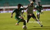 Penyerang PSS Sleman, Hokky Caraka berhasil melewati gelandang bertahan RANS Nusantara, Rizky Pellu saat pertandingan pekan ke-22 BRI Liga 1 di Stadion Maguwoharjo, Sleman, Yogyakarta, Jumat (8/12/2023). Tuan rumah PSS Sleman berhasil memetik poin penuh usai menang tipis 1-0 atas RANS Nusantara berkat gol dari tendangan bebas gelandang Jonathan Bustos. Pertandingan pekan ke-22 merupakan yang terakhir di Stadion Maguwoharjo, karena akan segera direnovasi hingga delapan bulan mendatang. (FOTO : Republika/Wihdan Hidayat)