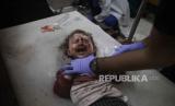 Seorang anak Palestina yang terluka akibat pemboman Israel di Jalur Gaza dirawat di Khan Younis pada Jumat (8/12/2023). (FOTO : AP Photo/Mohammed Dahman)