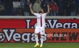 Olivier Giroud dari AC Milan merayakan gol pertama timnya pada pertandingan sepak bola Serie A Italia antara Atalanta dan AC Milan, di Stadion Gewiss di Bergamo, Italia, Ahad, (9/12/2023)dini hari WIB. (FOTO : Stefano Nicoli/LaPresse via AP)