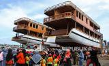 Sejumlah murid sekolah dasar didampingi orang tua dan gurunya melihat pembuatan Kapal Phinisi di Makassar, Sulawesi Selatan, Senin (11/12/2023). Pembuatan Kapal Phinisi tersebut dimanfaatkan oleh sejumlah sekolah di daerah itu untuk mengedukasi siswa tentang budaya dan sejarah Kapal Phinisi yang telah ditetapkan sebagai Warisan Budaya Takbenda (WBTB) oleh UNESCO pada 7 Desember 2017. (FOTO : Antara/Arnas Padda )