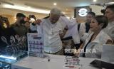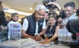 Capres no urut 3 Ganjar Pranowo menandatangani merchandise Ganjar-Mahfud yang dibeli oleh masyarakat saat acara grand launching official merchandise Ganjar-Mahfud di FX Senayan, Jakarta, Senin (11/12/2023). Official Merchandise Ganjar-Mahfud ini bertujuan untuk memfasilitasi masyarakat yang ngefans terhadap Ganjar-Mahfud sekaligus salah satu upaya TPN Ganjar-Mahfud untuk menggalang dana kampanye secara adil, jujur dan terbuka. (FOTO : Republika/Prayogi)