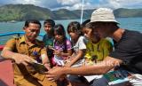 Sejumlah anak pengungsi korban longsor mengikuti kegiatan belajar di atas kapal belajar Alusi Tao Toba di Dermaga Desa Simangulampe, Humbang Hasundutan, Sumatera Utara, Senin (11/12/2023). Kapal belajar yang digunakan sejak tahun 2015 itu memiliki koleksi buku sebanyak 1.000 buku, berkeliling ke tujuh kabupaten di seputaran Danau Toba guna mencerdaskan anak dan menjaga minat baca sejak usia dini.   (FOTO : Antara/FransiscoCarollio)