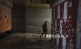 Seorang pria Yahudi bersenjata berjalan melalui deretan etalase toko yang ditutup untuk pemogokan umum yang menyerukan gencatan senjata di Gaza, di Kota Tua Yerusalem, Palestina, Senin (11/12/2023). (FOTO : AP/Maya Alleruzzo)