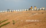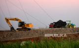 Truk pengangkut antre menunggu muatan saat pembangunan jalan tol Solo-Jogja di Klaten, Jawa Tengah, Selasa (12/12/2023). Untuk memperlancar arus mudik dan balik libur Natal 2023 dan Tahun Baru 2024 Pemerintah akan membuka Jalan Tol Solo-Jogja secara fungsional dari Kartasura hingga Klaten. Rencananya ini akan dilakukan mulai 22 Desember hingga 4 Januari mendatang. Tol Solo-Jogja yang akan digunakan sepanjang 13 Kilometer dari Colomadu hingga Karanganom, Klaten. (FOTO : Republika/Wihdan Hidayat)