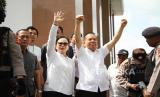 Terdakwa kasus korupsi dan gratifikasi di lingkungan Pemerintah Kabupaten Kapuas Ben Brahim S Bahat (tengah) bersama istrinya Ary Egahni (kedua kiri) menyapa pendukungnya sebelum menjalani sidang putusan di Pengadilan Tipikor, Palangka Raya, Kalimantan Tengah, Selasa (12/12/2023). Majelis Hakim menjatuhkan hukuman kepada mantan Bupati Kabupaten Kapuas Ben Brahim S Bahat dengan hukuman lima tahun penjara dan denda 500 juta subsider tiga bulan kurungan penjara, sedangkan Istrinya yang juga mantan Anggota DPR RI Ary Egahni dijatuhkan hukuman selama empat tahun penjara serta denda 500 juta subsider 3 bulan kurungan penjara. (FOTO : ANTARA FOTO/Auliya Rahman)