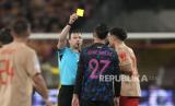 Wasit Felix Zwayer memberikan kartu kuning kepada pemain Sevilla Kike Salas saat pertandingan sepak bola Grup B Liga Champions antara Lens dan Sevilla di stadion Bollaert di Lens, Prancis, Rabu (13/12/2023) dini hari WIB. (FOTO : AP/Thibault Camus)