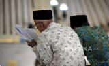 Abdi Dalem Kanca Kaji Keraton Yogyakarta membaca Al Quran saat Majelis Semaan Al Quran memperingati 277 Tahun Hadeging Nagari Kasultanan Ngayogyakarta Hadiningrat di Masjid Gedhe Kauman, Yogyakarta, Rabu (13/12/2023). Pengetan Hadeging Nagari Ngayogyakarta Hadiningrat atau Peringatan Berdirinya Kesultanan Yogyakarta dilakukan setiap 28-29 Jumadilawal Tahun Jawa. Semaan Al Quran ini dilakukan mulai habis Subuh hingga Isya atau sampai khatam oleh Kanca Kaji dan warga masyarakat. Perlu diketahui bahwa proklamasi berdirinya Kesultanan Yogyakarta pada 13 Maret 1755 Masehi atau 28 Jumadilawal 1680 Tahun Jawa. (FOTO : Republika/Wihdan Hidayat)