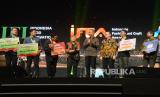 Menteri Perindustrian Agus Gumiwang Kartasasmita (keempat kanan) bersama Direktur Jenderal Industri Kecil, Menengah, dan Aneka (IKMA) Reni Yanita (kelima kanan) memberikan penghargaan kepada pemenang Gebyar IKMA 2023 di Mall Kota Kasablanka, Jakarta, Kamis (14/12/2023). Gebyar IKMA 2023 tersebut mengusung tema Innovate Locally, Thrive Globally Building Sustainable Ecosystem Through Small and Medium Inustries yang diikuti 113 IKM binaan guna mendorong penciptaan dan penguatan IKM. (FOTO : Dok Republika)