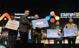 Menteri Perindustrian Agus Gumiwang Kartasasmita memberikan penghargaan kepada pemenang Gebyar IKMA 2023 di Mall Kota Kasablanka, Jakarta, Kamis (14/12/2023). Gebyar IKMA 2023 tersebut mengusung tema Innovate Locally, Thrive Globally Building Sustainable Ecosystem Through Small and Medium Inustries yang diikuti 113 IKM binaan guna mendorong penciptaan dan penguatan IKM. (FOTO : Dok Republika)
