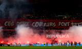 Penggemar Lilis menyalakan api selama pertandingan sepak bola Liga 1 Prancis antara Lille dan Paris Saint-Germain (PSG), di Lille, Prancis, Senin (18/12/2023) dini hari WIB. (FOTO : EPA-EFE/Mohammed Badra)