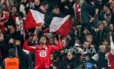 Jonathan David dari Lille melakukan selebrasi usai mencetak gol 1-1 pada pertandingan sepak bola Ligue 1 Prancis antara Lille dan Paris Saint-Germain (PSG), di Lille, Prancis, Senin (18/12/2023) dini hari WIB. (FOTO : EPA-EFE/Mohammed Badra)