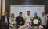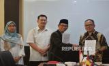 Direktur Operasional Republika Nur Hasan Murtiaji bersama Dekan Fakultas Sains dan Teknologi UIN Syarif Hidayatullah Jakarta Husni Teja Sukmana menunjukan nota penandatanganan kerjasama di Ruang Sidang Fakultas Sains dan Teknologi UIN Syarif Hidayatullah Jakarta, Senin (18/12/2023). Republika bekerjasama dengan Pusat Sains dan Teknologi UIN Syarif Hidayatullah Jakarta serta Fakultas Sains dan Teknologi UIN Syarif Hidayatullah Jakarta dalam bidang Pendidikan dan Pelatihan Teknologi Informasi (TI), Program Profesional Peserta Didik dan Magang dalam Inovasi Sains dan Teknologi serta hal-hal lain yang terkait dan atau mendukung TI. Kerja Sama ini bertujuan untuk membangun kerja sama yang produktif, efektif dan sinergis. (FOTO : Republika/Prayogi)