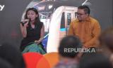 President Director PT Mastercard Indonesia Aileen Goh (tengah) bersama Direktur Pengembangan Bisnis PT MRT Jakarta (Perseroda) Farchad H. Mahfud (kanan) memberikan keterangan terkait kolaborasi antara Mastercard dan MRT Jakarta di Stasiun Senayan Mastercard, Jakarta, Senin (18/12/2023). Mastercard dan PT MRT Jakarta (Perseroda) berkolaborasi dalam meningkatkan pengalaman bertransportasi secara nontunai. Mastercard menghadirkan opsi nyaman untuk mengisi (top-up) dan membeli kartu MRT secara nontunai bagi pengguna MRT Jakarta. Penumpang dapat mengisi kartu MRT di semua loket MRT menggunakan kartu debit Mastercard. Penumpang juga memiliki opsi membeli tiket lewat aplikasi MyMRTJ menggunakan kartu kredit Mastercard. (FOTO : Republika/Prayogi)