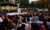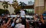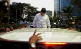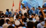 REPUBLIKA.CO.ID,JAKARTA-- Capres nomor urut dua Prabowo Subianto membagikan baju kepada relawan usai menghadiri acara Deklarasi Kaukus Generasi Muda Islam (Gemuis) di Balai Sarbini, Jakarta, Senin (18/12/2023).