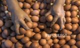 Pedagang menata telur ayam di kiosnya di Pasar Kosambi, Bandung, Jawa Barat, Selasa (19/12/2023). Harga sejumlah bahan pokok menjelang Natal dan Tahun Baru 2024 (Nataru) di pasar tersebut masih stabil dan stok bahan pangan mencukupi hingga akhir tahun. Saat ini harga daging ayam mencapai Rp38 ribu per kilogram, Cabai Rp100 ribu per kilogram, Beras Rp12 ribu hingga Rp15 ribu per kilogram dan telur ayam Rp28 ribu per kilogram. (FOTO : REPUBLIKA/ABDAN SYAKURA)