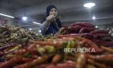 Pedagang menata cabai yang dijual di kiosnya di Pasar Kosambi, Bandung, Jawa Barat, Selasa (19/12/2023). Harga sejumlah bahan pokok menjelang Natal dan Tahun Baru 2024 (Nataru) di pasar tersebut masih stabil dan stok bahan pangan mencukupi hingga akhir tahun. Saat ini harga daging ayam mencapai Rp38 ribu per kilogram, Cabai Rp100 ribu per kilogram, Beras Rp12 ribu hingga Rp15 ribu per kilogram dan telur ayam Rp28 ribu per kilogram. (FOTO : REPUBLIKA/ABDAN SYAKURA)