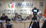 Ketua Bawaslu Rahmat Bagja (dua kiri) didampingi para jajaran Anggota Bawaslu saat memberikan keterangan terkait isu aktual pada tahapan kampanye di Kantor Bawaslu, Jakarta, Selasa (19/12/2023). 22 hari awasi kampanye, Bawaslu lakukan 90.716 upaya pencegahan, tangani 70 dugaan pelanggaran, 126 dugaan pelanggaran konten internet (siber) terkait Pemilu, dan menyelesaikan 13 sengketa proses antar-peserta Pemilu. (FOTO : Republika/Prayogi)