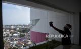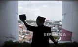 REPUBLIKA.CO.ID,BANDUNG  -- Pekerja membersihkan kaca di salah satu sudut di Sensa Hotel, Bandung, Jawa Barat, Selasa (19/12/2023).