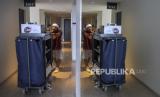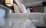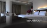Pekerja membersihkan area kamar hotel di Sensa Hotel, Bandung, Jawa Barat, Selasa (19/12/2023). Pihak hotel tersebut menargetkan tingkat okupansi hotel meningkat 80 persen dibandingkan dengan periode libur Natal dan Tahun Baru (Nataru) tahun lalu. (FOTO : REPUBLIKA/ABDAN SYAKURA)