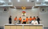 Tersangka Gubernur Maluku Utara Abdul Ghani Kasuba bersama tersangka lainnya saat dihadirkan dalam konferensi pers pengumuman penahanan tersangka di Gedung KPK Merah Putih, Jakarta, Rabu (20/12/2023). KPK resmi menahan tersangka dalam kegiatan Operasi Tangkap Tangan (OTT) terkait dugaan tindak pidana korupsi pemberian hadiah atau janji untuk proyek pengadaan barang dan jasa serta perizinan di lingkungan pemerintah Provinsi Maluku Utara yang menyeret Gubernur Maluku Utara Abdul Ghani Kasuba, Kadis Perumahan dan Pemukiman Adnan Hasanudin, Kadis PUPR Daud Ismail, Kepala BPPBJ Ridwan Arsan, Ajudan Ramadhan Ibrahim, pihak swasta Stevi Thomas dan Kristian Wuisan. Dalam kegiatan tangkap tangan tersebut KPK mengamankan barang bukti Rp750 juta dari total dugaan penerimaan Rp2,2 miliar. (FOTO : Republika/Thoudy Badai)