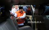 Tersangka Gubernur Maluku Utara Abdul Ghani Kasuba bersama tersangka lainnya menaiki mobil usai dihadirkan dalam konferensi pers pengumuman penahanan tersangka di Gedung KPK Merah Putih, Jakarta, Rabu (20/12/2023). KPK resmi menahan tersangka dalam kegiatan Operasi Tangkap Tangan (OTT) terkait dugaan tindak pidana korupsi pemberian hadiah atau janji untuk proyek pengadaan barang dan jasa serta perizinan di lingkungan pemerintah Provinsi Maluku Utara yang menyeret Gubernur Maluku Utara Abdul Ghani Kasuba, Kadis Perumahan dan Pemukiman Adnan Hasanudin, Kadis PUPR Daud Ismail, Kepala BPPBJ Ridwan Arsan, Ajudan Ramadhan Ibrahim, pihak swasta Stevi Thomas dan Kristian Wuisan. Dalam kegiatan tangkap tangan tersebut KPK mengamankan barang bukti Rp750 juta dari total dugaan penerimaan Rp2,2 miliar. (FOTO : Republika/Thoudy Badai)