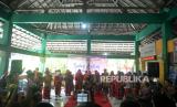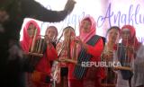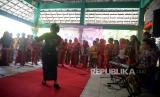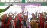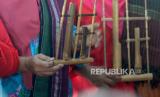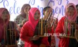 Buruh gendong bersama Perempuan Berkebaya Indonesia menggelar pertunjukan Dendang Angklung Selendang Gendong di Pendopo Timur Pasar Beringharjo, Yogyakarta, Rabu (20/12/2023). Pertunjukan angklung bersama butuh gendong Pasar Beringharjo ini dalam rangka menyambut Hari Ibu 22 Desember mendatang. Sebanyak 30an buruh gendong dilibatkan untuk berbagi dan menyemarakkan agenda tahunan ini. Semua penampilan acara ini perempuan dan menggunakan kebaya. (FOTO : Republika/ Wihdan Hidayat)