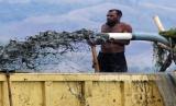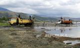 Penambang menaikkan pasir ke atas truk menggunakan mesin penyedot di Kampung Ifar Besar, Sentani, Jayapura, Papua, Rabu (20/12/2023). Untuk mengatasi pendangkalan danau yang terus terjadi di wilayah itu dan menekan beban biaya pengerukan, pemerintah daerah setempat membuka kawasan itu sebagai wilayah pertambangan rakyat galian C berupa pasir sekaligus untuk menambah sumber pendapatan daerah melalui retribusi . (FOTO : Antara/Gusti Tanati)