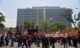 REPUBLIKA.CO.ID, JAKARTA-- Sejumlah Buruh melakukan aksi unjuk rasa di depan Kedubes Amerika, Jakarta, Kamis (21/12/2023).