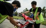 Petugas menempelkan stiker penanda motor milik peserta mudik gratis di Terminal Tipe A Pondok Cabe, Tangerang Selatan, Banten, Jumat (22/12/2023). Kementerian Perhubungan (Kemenhub) menyediakan 30 kuota mudik motor gratis yang akan diantar menggunakan truk menuju Kota Solo dan Yogyakarta dalam rangka pelayanan angkutan darat saat libur Natal 2023 dan Tahun Baru 2024. (FOTO : ANTARA FOTO/Sulthony Hasanuddin)