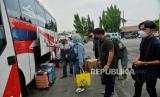 Calon penumpang mengangkut koper sebelum keberangkatan bus tujuan Sumatera di Terminal Kampung Rambutan, Jakarta, Sabtu (23/12/2023). Jelang libur Natal dan Tahun Baru 2024, terminal Kampung Rambutan dipadati calon penumpang tujuan Lampung, Palembang dan Padang dengan jumlah penumpang mengalami kenaikan hingga 25 persen dari hari biasanya. Selain itu, Kementerian Perhubungan juga menyediakan angkutan mudik gratis Natal 2023 dan Tahun Baru 2024 sebanyak 90 bus dengan jumlah penumpang mencapai 3.600 pemudik. (FOTO : Republika/Thoudy Badai)