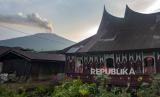 Seorang warga berada di balik jendela rumah gadang saat Gunung Marapi mengeluarkan abu vulkanik di Nagari Panyalaian, Tanah Datar, Sumatera Barat, Ahad (24/12/2023). (FOTO : ANTARA FOTO)