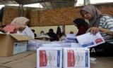REPUBLIKA.CO.ID, BANDAR LAMPUNG -- Sejumlah pekerja menyortir dan melipat surat suara di gudang KPU Kota Bandar Lampung, Lampung, Ahad (24/12/2023).