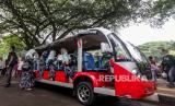 Pengunjung menaiki mobil angkutan saat berwisata di Taman Margasatwa Ragunan, Jakarta, Senin (25/12/2023). Taman Margasatwa Ragunan menjadi tempat wisata alternatif bagi masyarakat Jabodetabek saat libur Hari Raya Natal dan Tahun Baru 2024. Tercatat hingga pukul 11.00 WIB, sebanyak 19.688 masyarakat berkunjung ke kebun binatang tersebut untuk melihat berbagai jenis satwa. (FOTO : Republika/Putra M. Akbar)