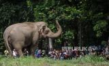 Pengunjung melihat gajah saat berwisata di Taman Margasatwa Ragunan, Jakarta, Senin (25/12/2023). Taman Margasatwa Ragunan menjadi tempat wisata alternatif bagi masyarakat Jabodetabek saat libur Hari Raya Natal dan Tahun Baru 2024. Tercatat hingga pukul 11.00 WIB, sebanyak 19.688 masyarakat berkunjung ke kebun binatang tersebut untuk melihat berbagai jenis satwa. (FOTO : Republika/Putra M. Akbar)
