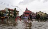 Hujan deras pada Minggu malam (24/12) hingga Senin pagi bersamaan dengan pasang air laut menyebabkan pemukiman, pertokoan, rumah ibadah dan perkantoran di tiga kecamatan dilanda banjir setinggi 40 sentimeter.