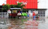 Seorang pedagang berjualan di pinggir jalan yang terendam banjir di Dumai, Riau, Senin (25/12/2023). Hujan deras pada Minggu malam (24/12) hingga Senin pagi bersamaan dengan pasang air laut menyebabkan pemukiman, pertokoan, rumah ibadah dan perkantoran di tiga kecamatan dilanda banjir setinggi 40 sentimeter. (FOTO : Antara/Aswaddy Hamid)