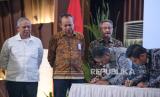 REPUBLIKA.CO.ID, JAKARTA -- Direktur Consumer Bank BTN Hirwandi Gafar bersama Direktur Jenderal Pembiayaan Infrastruktur Pekerjaan Umum dan Perumahan Herry Trisaputra Zuna, Direktur Jenderal Perumahan Iwan Suprijanto dan Komisioner BP Tapera Adi Setianto berfoto bersama saat penandatanganan perjanjian kerja sama KPR Sejahtera FLPP dengan Bank Penyalur dan Asosiasi Pengembang Perumahan Tahun 2024 dengan BP Tapera di Jakarta, Kamis (28/12/2023). Bank BTN berkomitmen menjadi mitra Pemerintah dan BP Tapera untuk terus berkontribusi pada tahun 2024 mewujudkan mimpi Masyarakat Berpenghasilan Rendah (MBR) memiliki hunian yang layak. BP Tapera memberikan apresiasi kepada Bank BTN dan BTN Syariah sebagai Bank penyalur FLPP tertinggi dan membukukan pertumbuhan tertinggi sepanjang tahun 2023.