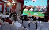 Presiden Joko Widodo (layar kiri) melakukan panggilan tatap muka jarak jauh dengan sejumlah anggota TNI di wilayah terpencil saat meresmikan Stasiun bumi Satelit Republik Indonesia (SATRIA)-1 di Desa Matungkas, Minahasa Utara, Sulawesi Utara, Kamis (28/12/2023). Pemerintah melalui Kementerian Komunikasi dan Informatika (Kominfo) membangun 11 stasiun bumi di sejumlah lokasi di Indonesia yang akan memancarkan balik gelombang telekomunikasi menggunakan satelit SATRIA-1 berkapasitas 150 Gbps yang merupakan satelit terbesar di Asia dan ke-5 di dunia untuk menopang layanan akses internet 37 ribu titik dengan kecepatan hingga sekitar 5 Mbps. (FOTO : ANTARA FOTO/Adwit Pramono)