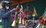 Pengrajin terompet menyelesaikan pembuatan trompet di Jalan Pintu Besar Selatan, Glodok, Jakarta, Jumat (29/12/2023). Menjelang akhir tahun, para pengrajin dan penjual trompet musiman mulai berdatangan dikawasan tersebut. Salah seorang pengrajin terompet asal Cikarang yaitu Sarmat sudah berjualan terompet musiman di tempat itu sejak tahun 80-an. Tahun 2023 ini merupakan tahun pertama dia kembali berjualan, setelah 3 tahun sebelumnya tidak berjualan akibat pandemi COVID-19. Harga terompet berkisar dari Rp 5.000 hingga Rp 15.000 tergantung ukuran. Berbagai pesanan pun sudah diterina mulai dari hotel, cafe, perusahaan hingga perorangan. (FOTO : Republika/Prayogi)