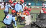 REPUBLIKA.CO.ID, MALANG -- Relawan mengevakuasi korban kebakaran dari ketinggian dalam simulasi penanganan bencana di stadion Gajayana, Malang, Jawa Timur, Sabtu (30/12/2023).
