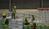 Pekerja mengakut beras BULOG di Kompleks pergudangan modern Perum BULOG, Kelapa Gading, Jakarta, Sabtu (30/12/2023). (FOTO : Republika/Prayogi)