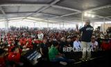 Pada kesempatan in, Ganjar Pranowo menyampaikan gagasannya terkait program unggulan yang ditawarkan Ganjar-Mahfud yakni KTP Sakti agar bantuan pemerintah tepat sasaran. (FOTO : Republika/Thoudy Badai)