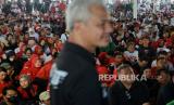 Calon presiden nomor urut 3 Ganjar Pranowo saat kampanye peluncuran program KTP Sakti di Lapangan Bangsalan, Kecamatan Teras, Kabupaten Boyolali, Jawa Tengah, Sabtu (30/12/2023). (FOTO : Republika/Thoudy Badai)