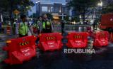 Polisi menata water barrier untuk pengalihan arus lalu lintas di kawasan Sudirman, Jakarta, Ahad (31/12/2023). Polda Metro Jaya melakukan penutupan ruas jalan Sudirman hingga jalan MH Thamrin selama pelaksanaan Car Free Night pada malam pergantian tahun baru 2023-2024. (FOTO : Republika/Putra M. Akbar)