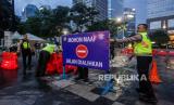 Polisi berjaga saat melakukan pengalihan arus lalu lintas di kawasan Sudirman, Jakarta, Ahad (31/12/2023). Polda Metro Jaya melakukan penutupan ruas jalan Sudirman hingga jalan MH Thamrin selama pelaksanaan Car Free Night pada malam pergantian tahun baru 2023-2024. (FOTO : Republika/Putra M. Akbar)
