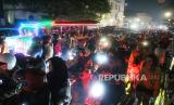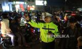 Polisi lalu lintas berupaya mengatur lalu lintas di kawasan Jalan Asia Afrika, Kota Bandung, saat malam pergantian tahun baru 2024, Ahad (31/12/2023). Kawasan Jalan Braga, Asia Afrika dan Alun-alun, menjadi pusat titik kumpul warga saat merayakan malam Tahun Baru. Meski pusat kota dikepung macet, perayaan Tahun Baru di Kota Bandung berlangsung kondusif. (FOTO : Edi Yusuf/Republika)