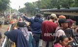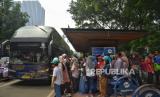 Warga mengantre untuk menaiki Bus Wisata Transjakarta di Kawasan Monas, Jakarta, Senin (1/1/2024). Fasilitas bus tingkat wisata Transjakarta ini masih diminati warga untuk mengisi liburan tahun baru. Bus tingkat gratis itu memungkinkan warga menikmati pemandangan lanskap gedung-gedung perkantoran di Ibu Kota. Banyak dari warga yang menganjak anak-anak. (FOTO : Republika/Prayogi)
