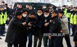 Polisi mengamankan pelaku penyerangan terhadap Ketua oposisi utama Partai Demokrat Korsel Lee Jae-myung di Kantor Polisi Gangseo ke Kantor Polisi Metropolitan Busan, Korea Selatan, Selasa (2/1/2024). Lee Jae-myung diserang oleh seorang pria saat melakukan kunjungan terakhirnya ke lokasi pembangunan bandara di Pulau Gadeok di lepas pantai Busan. (FOTO : EPA-EFE/YONHAP )