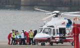 Ketua oposisi utama Partai Demokrat Korsel Lee Jae-myung, diangkut dengan tandu ke Rumah Sakit Universitas Nasional Seoul setelah tiba di landasan helikopter di sepanjang Sungai Han di Seoul, Korea Selatan, Selasa (2/1/2024). Lee Jae-myung diserang oleh seorang pria saat melakukan kunjungan terakhirnya ke lokasi pembangunan bandara di Pulau Gadeok di lepas pantai Busan. (FOTO : EPA-EFE/YONHAP)